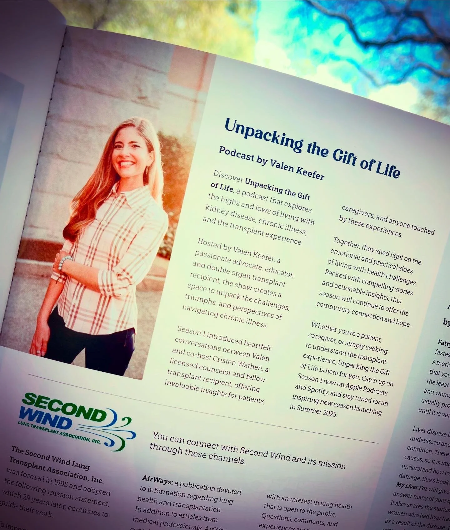 Valen’s podcast, Unpacking the Gift of Life, was featured in the Spring 2025 issue of Bonus Days Magazine (page 7) as a resource for the transplant community. This heartfelt and empowering publication shares stories of resilience and well-being along the transplant journey. Valen is forever grateful for every bonus day.